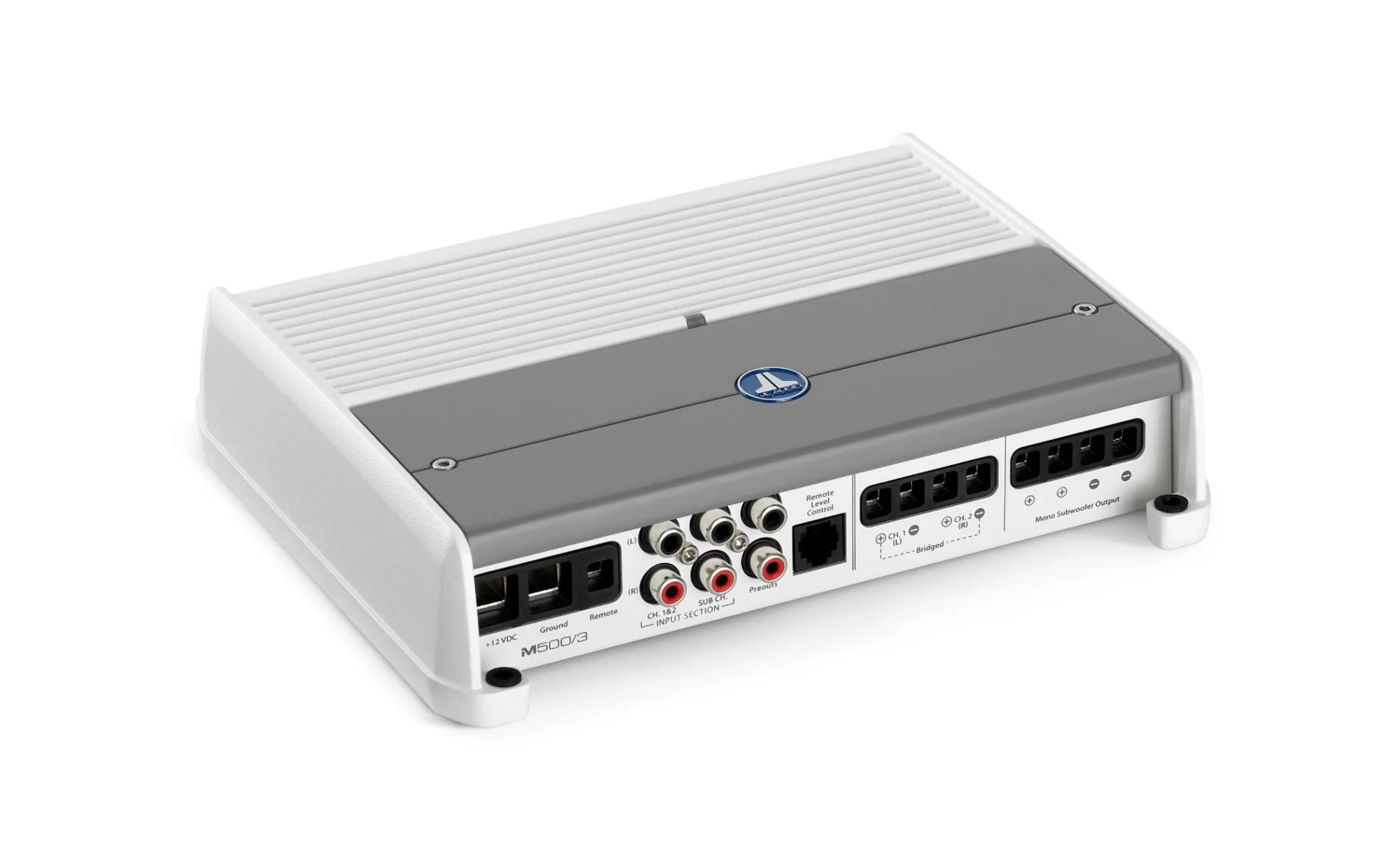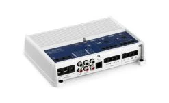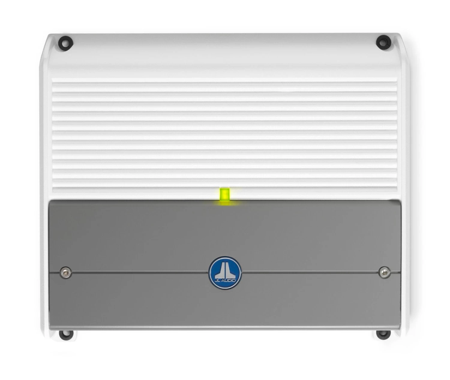 This marine amplifier features white and gray powder-coat finishes, a gasketed cover for the controls and stainless steel hardware for durability in the marine environment.