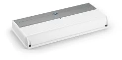 This marine amplifier features white and gray powder-coat finishes, a gasketed cover for the controls and stainless steel hardware for durability in the marine environment.