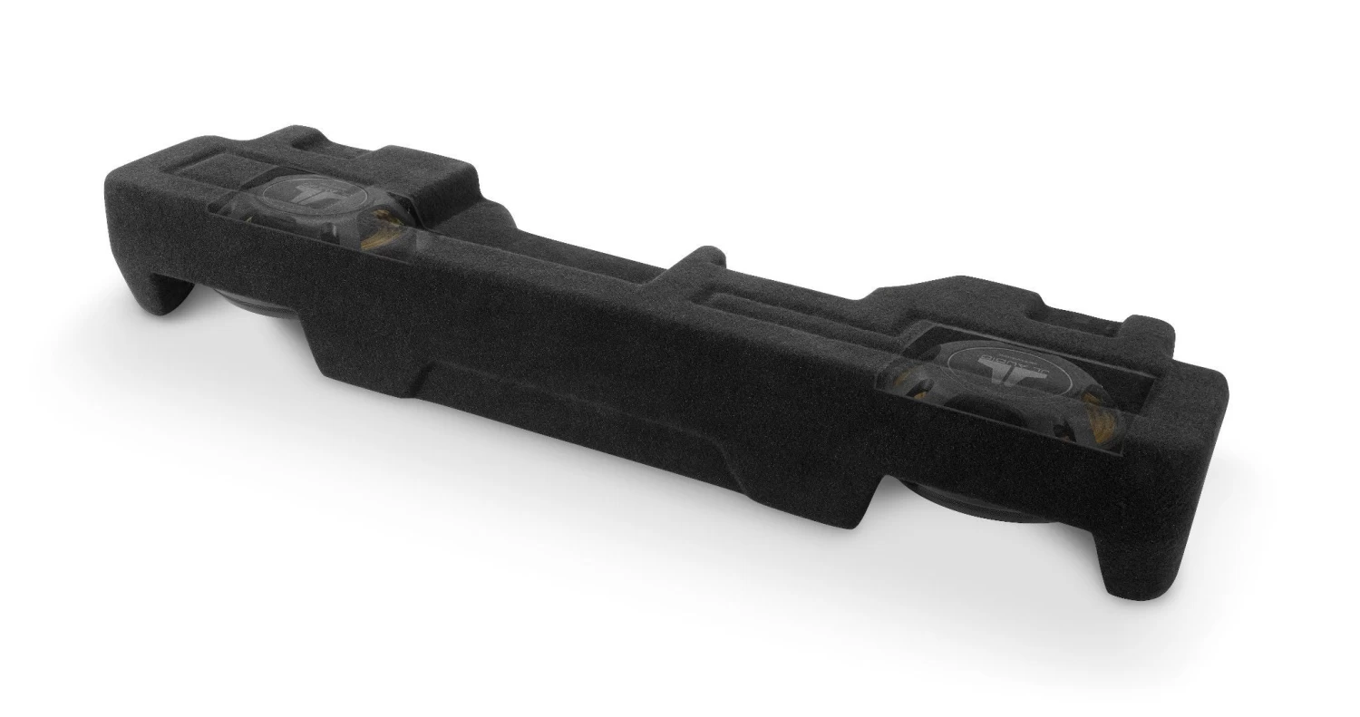 Fortunately, our engineers tackled this challenge head on and developed a subwoofer solution that fills your Crew Cab with stunning amounts of deep bass output. Featuring a 100% fiberglass, sealed enclosure design, this Stealthbox® houses two of our revolutionary 12TW3 thin-line subwoofers and installs neatly under the rear seat, without compromising rear seat comfort. Rear seat folding is unaffected, and we even left space on the enclosure that’s perfect for a clean, hidden amplifier installation!