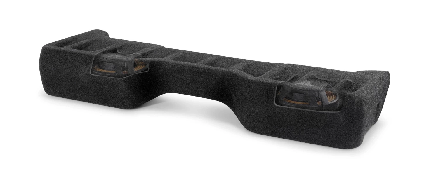 Fortunately, our engineers developed a subwoofer solution that fills your Crew Cab with loads of powerful bass output. Featuring a 100% fiberglass, sealed enclosure design, this Stealthbox® houses two of our innovative 10TW3 thin-line subwoofers and installs neatly under the rear seat, without compromising rear seat comfort or folding.