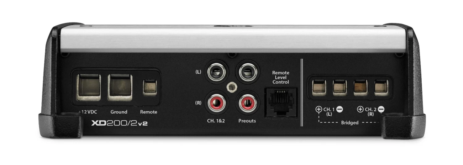 The XD200/2v2 also features the v2 Spec feature set, which consists of automatic turn-on capability (via signal sensing or DC-offset sensing), and a dual-range differential-balanced input section able to handle a wide range of input voltage levels. With the addition of an HD-RLC remote level control (sold separately), the amplifier’s level can be directly controlled from the driver’s seat.